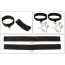 Dva D-obročka na koncih blazine lahko uporabite za hitro pritrditev priloženih manšet za zapestje in gležnje z njihovimi zaponkami. Tako kot obe stegenski manšeti z dvema zaskočnima verižicama. Manšete in trakove je mogoče hitro namestiti in sneti z zaponko na kavelj in zanko ter so nastavljivi, da se prilegajo. Priložena oblazinjena preveza za oči in žogica pripomoreta k očarljivi izkušnji. Oba sta tudi nastavljiva.
